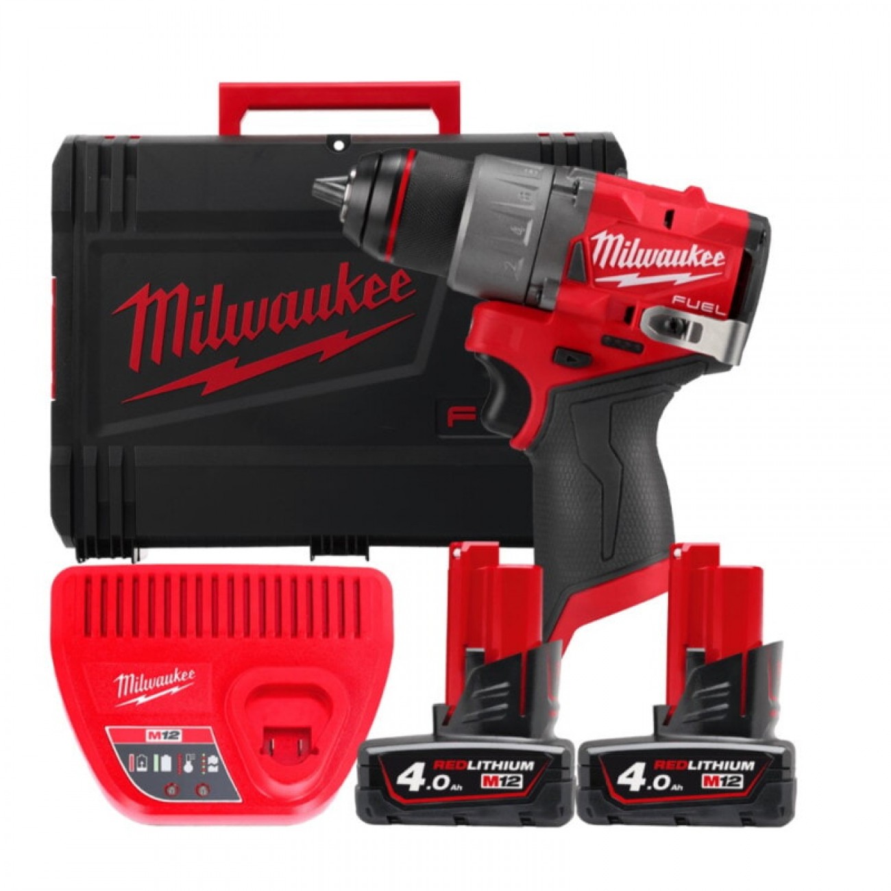Комплект постачання Акумуляторний шуруповерт Milwaukee M12 FDD2-402X - 1 шт. 2 x M12 B4 Акумуляторні набори Зарядний пристрій Milwaukee C12 C – 1 шт. Інструкція з експлуатації – 1 шт. Постачається в кейсі