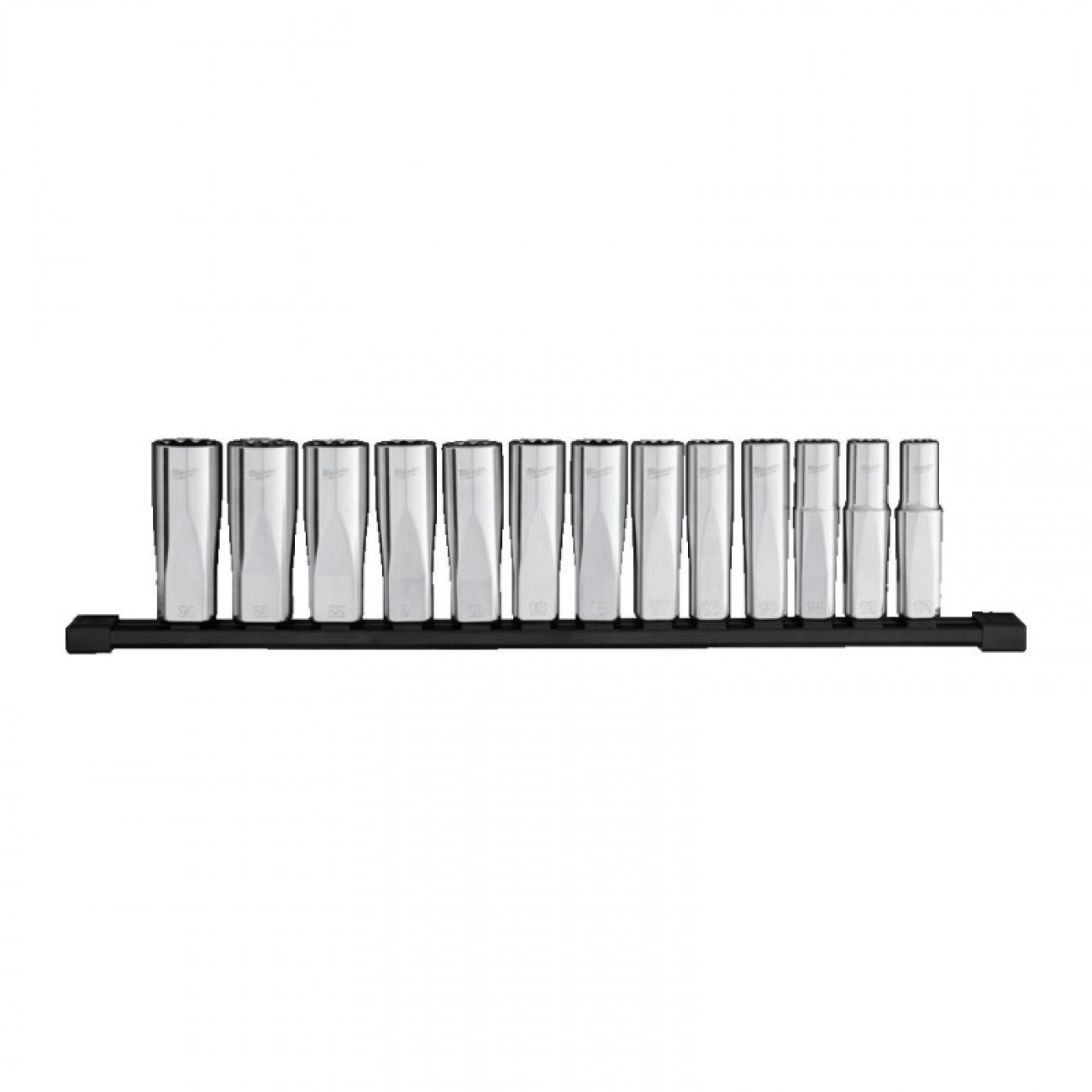 Основні характеристики Набор головок торцевых хромированых метрических ½” MILWAUKEE, (12 гранн.), удлиненные, планка (13шт)
