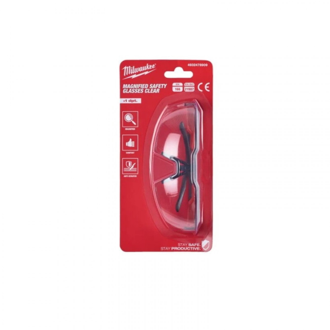 Зручна пара незапітніючих захисних окулярів від Milwaukee з міцними прозорими лінзами, стійкими до подряпин, з вбудованими лінзами, що коректують +2,5.