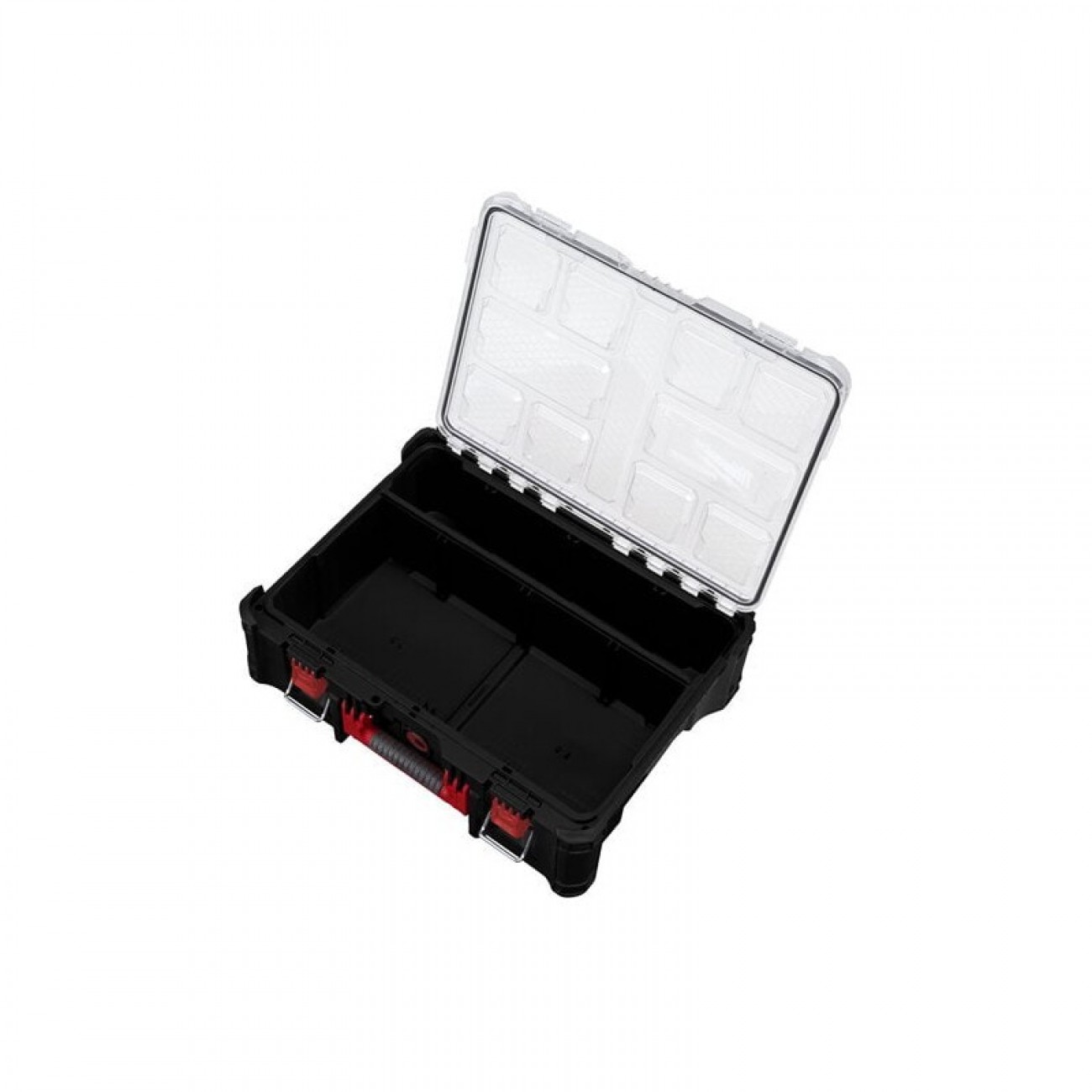 На 50% вище, ніж стандартний органайзер PACKOUT™ - ідеально підходить для зберігання інструментів, акумуляторів, зарядних пристроїв, великогабаритної фурнітури та іншого обладнання. Розділові планки, які дозволяють користувачам повністю організувати внутрішній простір органайзера під себе. Вантажопідйомність 22 кг. Частина модульної системи зберігання PACKOUT™. Сконструйований з використанням ударостійких полімерів для тривалого терміну служби в умовах будівельного майданчика. Ступінь захисту IP65 для захисту від води та будівельного сміття.