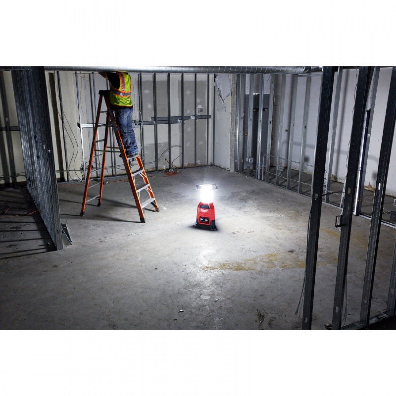 Без аккумулятора в комплекте; вес 12,1; сетевой 220В; аккумулятор 18В; 3 режима; светоотдача 9000/4800/2500 люмен; заряжает аккумуляторы; ONE-KEY; кабель 2,5м; разъём SCHUKO GALP