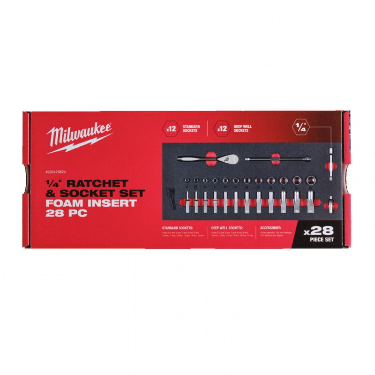 Ложемент с головками хромированными и трещоткой 1/4˝ (28шт) MILWAUKEE (45х178,5х417мм) для тележек
