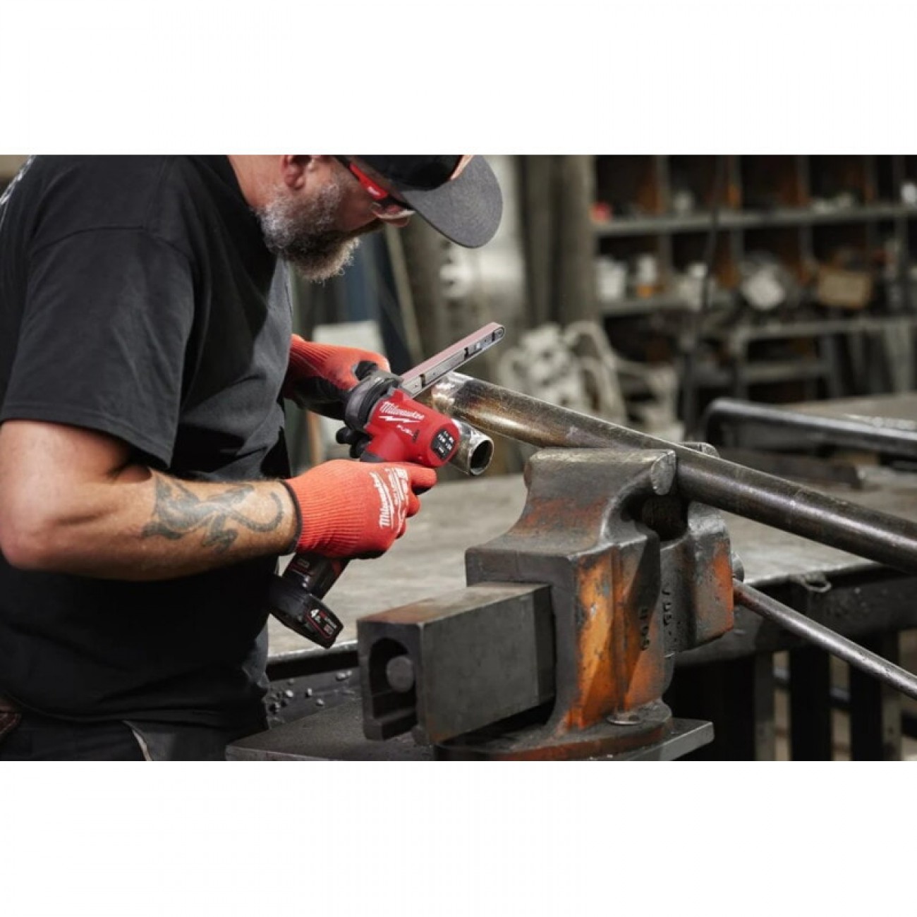 Перша у світі стрічкова шліфувальна машина з живленням від акумулятора 12 В та шириною стрічки 13 мм. Найлегша акумуляторна стрічкова машина шліфувальна на ринку всього 1,1 кг з аккумулятором 2 Ач. Він перевершує пневматичних конкурентів, забезпечуючи кращий баланс 2 режими швидкості + курок із регульованою швидкістю - забезпечують максимальний контроль від видалення зварних швів до точної обробки нержавіючої сталі, алюмінію та дерева. Реверсивний режим - дозволяє користувачеві вибрати напрямок руху стрічки по відношенню до напрямку іскрів/стружок Робота однією рукою – дозволяє працювати в обмеженому просторі та ідеально підходить для роботи над головою Регулювання головки на 360° без використання інструментів - найкраще поводження в будь-якій робочій середовищі + можливість компактного зберігання Запобіжний крючок спуску підвійної дії з функцією блокування для менш напруженої роботи за більш тривалого використання. Заміна ремня без інструментів Світлодіод освітлює робочу зону для кращої видимості ДНК нашої платформи FUEL™ перевизначає баланс між акумуляторними технологіями. Безщітковий двигун MILWAUKEE® POWERSTATE™, батарея REDLITHIUM™ та електронний інтелект REDLINK PLUS™ забезпечують чудову продуктивність, час роботи та надійність. Гнучка система живлення: працює зі всіма аккумуляторами M12™ MILWAUKEE®.