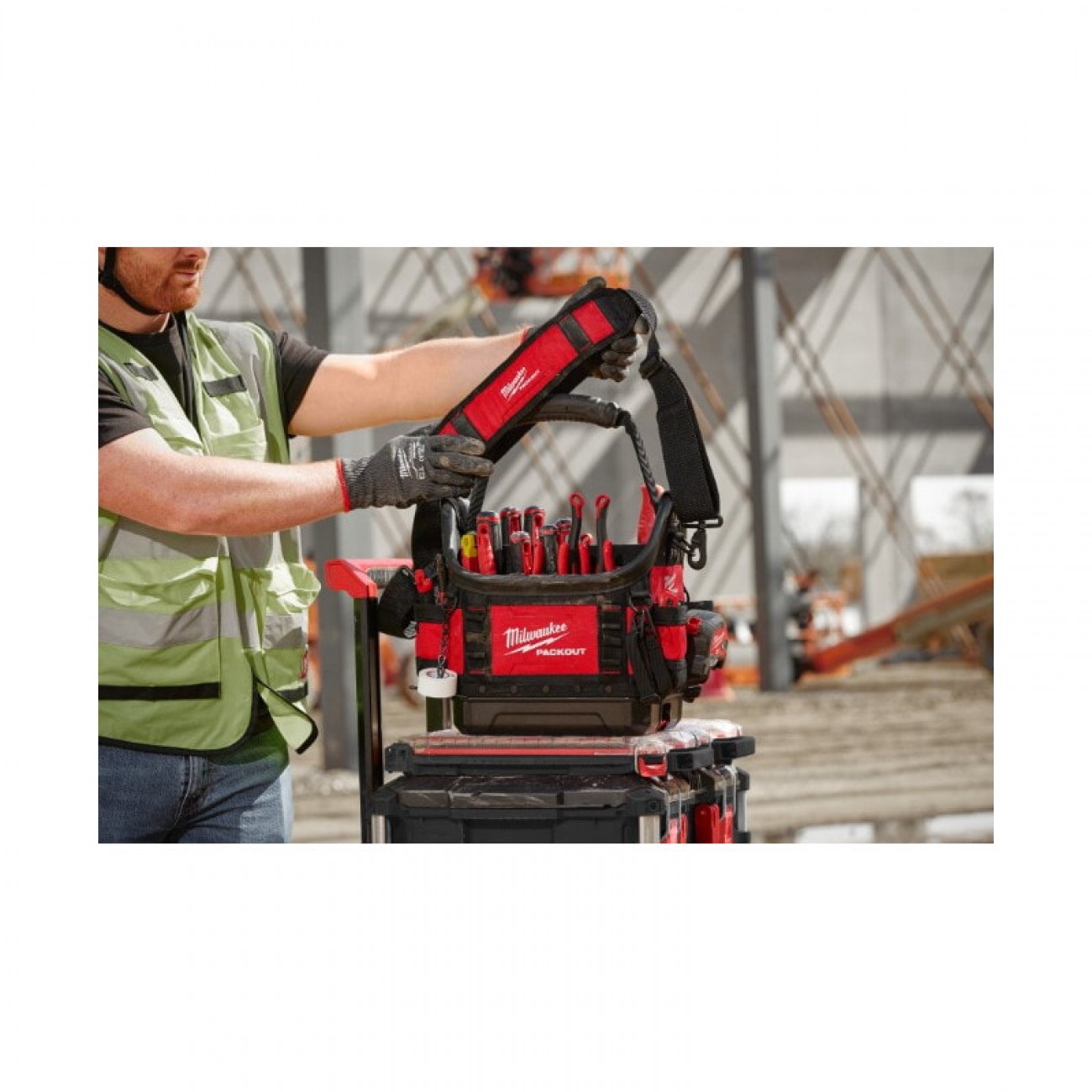 Посилені краї, металеві кільця та пружини для максимального терміну служби. 35 кишень для найкращого зберігання інструментів. Плечовий ремінь та ергономічна ручка для перенесення. Тримач для клейкої стрічки для легкого доступу. Формована основа PACKOUT™ захищає від вологи та сміття. Частина модульної системи зберігання PACKOUT™.
